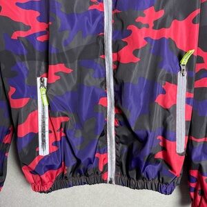 men’s windbreaker, camo jacket, red and blue camouflage, hooded jacket, lightweight outerwear, water-resistant, size large, casual jacket, outdoor apparel