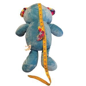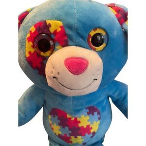 • Blue plush bear with multicolor patchwork puzzle pattern on ears, eyes, and heart