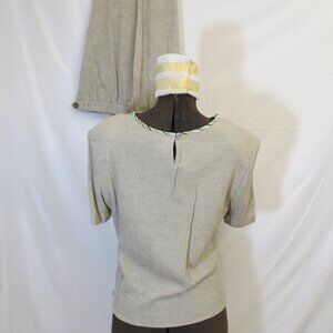 Top is beige textured fabric with black, turquoise, olive, beige, white striped collar coordinating with jacket. Single button keyhole back. PTP 21”, length 24”