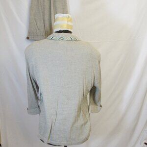 Jacket is collared, button down, with ¾ rolled sleeves. Jacket is textured beige with differently textured white panels with fringe edge, floral panels (turquoise, green, tan, black, white), and beige panel with southwestern decoration and attached wood button and beads. All buttons are decorative wood buttons. Pocket lower right. Collar has same striped edge as top. PTP 23”, length 28”
