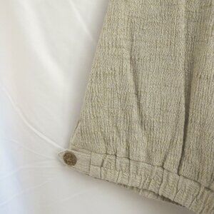 Slacks are beige, textured, elastic waist with decorative, fake, tab and button front, onseam pockets, and 24” inseam