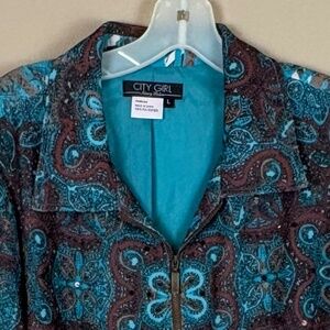 Nancy Bolen City Girl Vintage Turquoise/Brown/Off White Animal Print Long Sleeve Lined Jacket with Brown Sequin Accents, Front Zippered Closure, and Thin Shoulder Pads; Size L; When lying flat, measures 22" pit to pit and 29" in length from top of back collar to bottom hem; Fabric and Care instructions shown in pictures