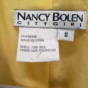 Nancy Bolen City Girl - Women's Yellow Silk Birds of Paradise Blazer Jacket Size Small. Shell 100%Silk. Lining 100%Polyester. Approx. measurements pit to pit 18.5 in. Sleeve length 19 in. Jacket length 24 in. pin hole collar and light stain inner neck lining barely noticeable. Pre-owned in good condition.