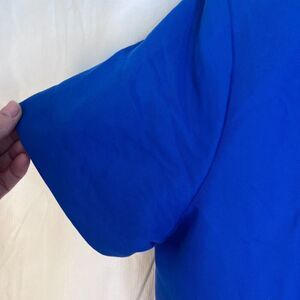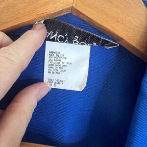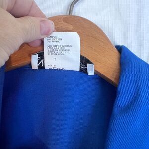 TOP: Notched collar, short sleeve, button down, rimmed statement buttons, geometric patterned hem, shoulder pads (could easily be removed)