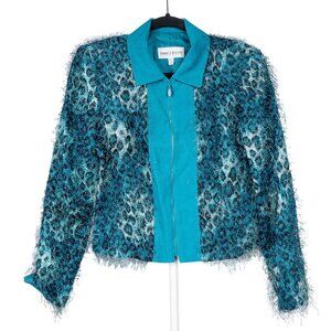 Nancy Bolen VTG Leopard Print Eyelash Jacket 4 Womens Teal Full Zip Fuzzy USA