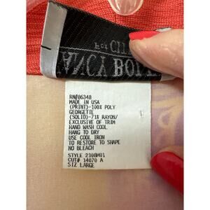 Peach, coral, yellow and purple. Pit to pit on the back 23 inches, length from seam of collar 28 inches. Paisley look on the back. Bolo look Lapel