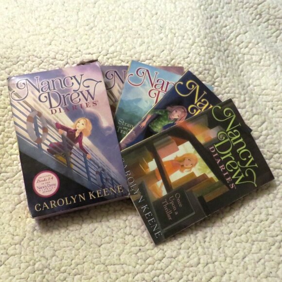 Nancy Drew Diaries 4-Book Series Set by Carolyn Keene. Book 1 – Curse of the Arctic Star, Book 2 – Strangers on a Train, Book 3 – Mystery of the Midnight Rider and Book 4 – Once Upon a Thriller. All books in very good condition. Outer box has rip on top – see photo. Lots of great reading left in these books!