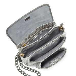 Smart accordion shape crafted in exotic leathers Crossbody strap, about 40" long Magnetic snap-flap closure Silvertone hardware Four slip ...