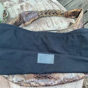 I bought this bag at Neiman Marcus in Las Vegas years ago for $2,900 or so. The inside shows wear which is easy to do because it’s beige suede but there are no weird smells, smoke, perfume, etc. The outside of the bag shows a little wear as some of the snake scales have lifted but it’s not obvious and very hard to picture. This is a large shoulder bag and I still get compliments on it. Comes with the dust bag as pictured.