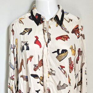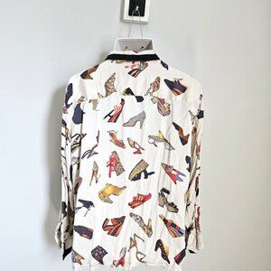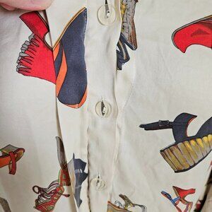 Vintage long sleeve silk blouse by Nancy Heller with a fabulous shoe print! From the late 80's or early 90's this buttonup top has a hidden button line. Black lined collar and cuffs. Size 14 100% Silk The buttons are missing on the cuffs but the rest of the blouse is in good condition (no holes no stains) PLEASE NOTE: This item will be cleaned and look a bit nicer before sending to buyer. I wanted to get it posted. Pairs well with the classic "Shoes" song by LiamKyleSullivan, lol Shoes print blouse workwear officewear buttonup buttondown silk 80s 90s vintage abstract art to wear