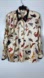 Adorable unique and beautifully crafted silk blouse. Has allover shoe print. Trimmed with black silk on neckline and wrists with gold buttons.