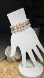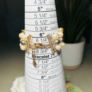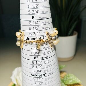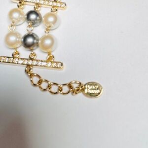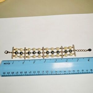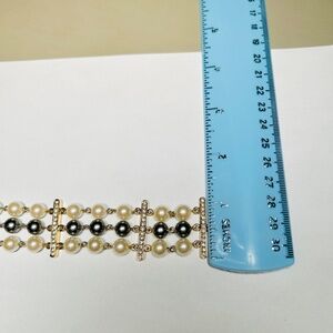 Triple strand gray and white faux pearl link bracelet in gold tone metal with rhinestones. It is 1" wide with adjustable wearable length of 6.5” to 7.0”.