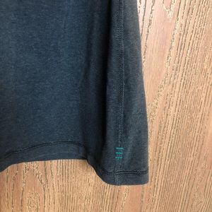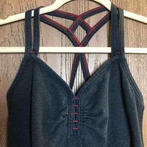 Medium charcoal Gray Racerback with built in sports bra. Lying flat: pit to pit 14”, bust to hem 18”. Flares out. Red accent. Good, used condition.