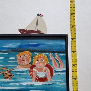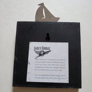Wooden Plaque is 5"x5" and the metal sailboat adds almost 2" to the height (see pictures for measurements). This piece of folk art is in excellent vintage condition.  (Note:  There is some scuffing to the back; see pictures).
