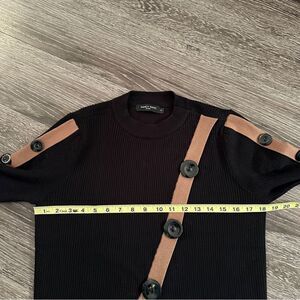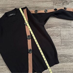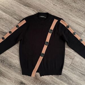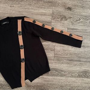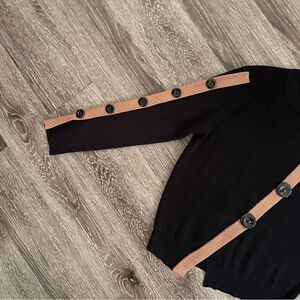 Black ribbed with asymmetric tan detail stripes with buttons