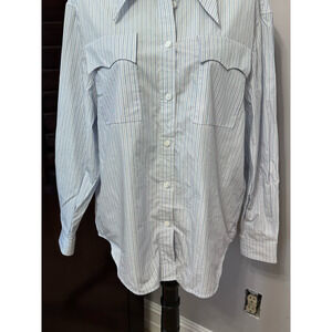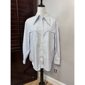 Nancyavally Womens Button Up Shirt Blue Striped Long Sleeve Pockets Preppy S