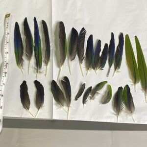 24 piece (pictured) mixed Nanday Conure parrot feathers. Naturally molted. Single bird. Blue, green, black. 6” and smaller.