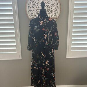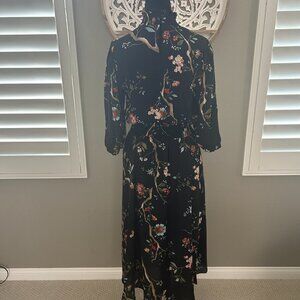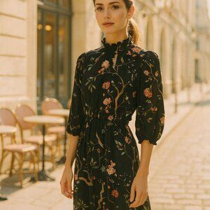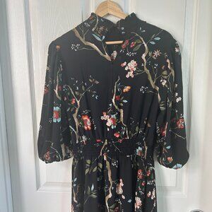 Nanette Lepore dress, smock waist dress, black floral dress, boho chic dress, size 6 dress, women's floral dress, casual dress, semi-formal dress