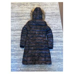 Nanette Lapore knee-length puffer coat in deep purple camouflage. It has a zipper-removable faux-fur lined hood, full-length two-way zipper down the front side, zippered pockets, and cuffed sleeves for extra wind protection. Excellent condition, barely worn. Size XS.