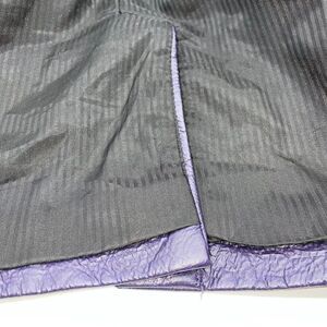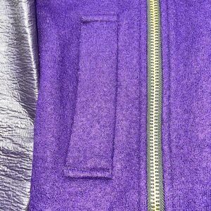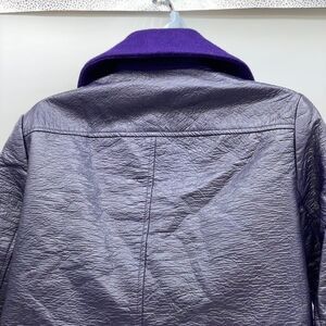 Rich purple wool body with Polyurethane blend back and sleeves. Gold working and accent zippers. Pockets in the front.