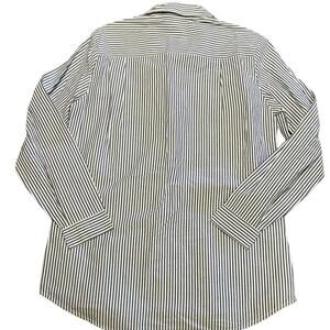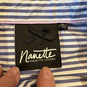 This beautiful Nanette Lepore blouse is a must-have for any fashion-forward woman! The blue and white stripes are classic and versatile, while the delicate embroidery adds a touch of elegance and charm.