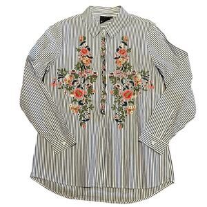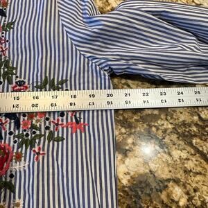 Nanette LePore Women’s Size Large Blue and White Striped Embroidered Blouse
