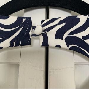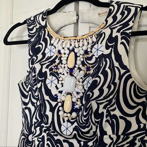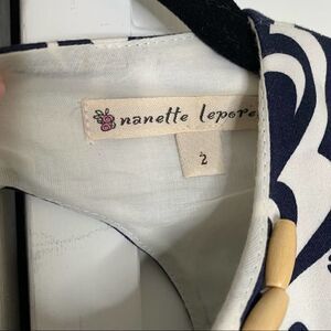Beautiful navy and white Nanette Lenore Dress in good preowned condition. No flaws. Navy and white pattern with intricate beading detail on the front chest. Key hole back with button closure at the top. Armpit to armpit is 15 inches and length is 34 inches. Dart seams in the front and small pleatsin the front and back. 97% cotton and 3% spandex.