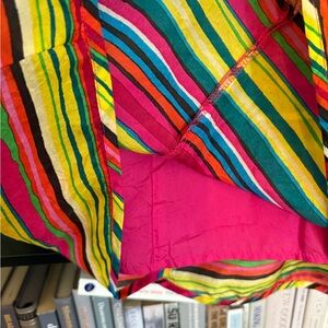 Eye-catching asymmetrical skirt with bold stripes. Features a dynamic mix of colors. Perfect for adding flair to your outfit. Small spot as pictured. May wash out but I’m not sure. Flaw reflected in the price. Layflat Measurements: waist 16”, hips 21.5”, length 24”. Size 10