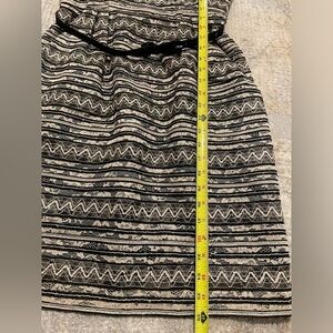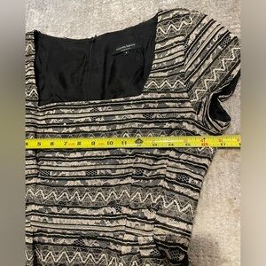 This elegant dress features a striking black and beige pattern, perfect for any occasion and is loaded with intriguing details from the lace, belt, square neckline, sequins speckled throughout or the ribbons woven into it to be a unique and interesting piece for any closet.