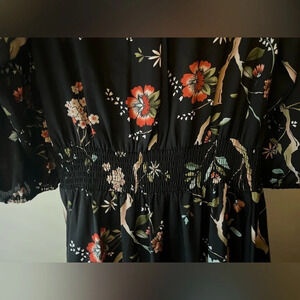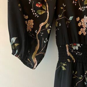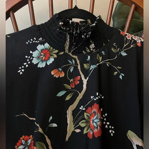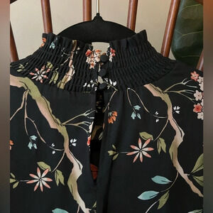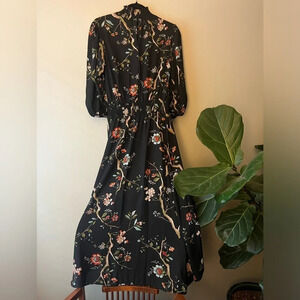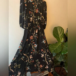 This breathtaking dress by Nanette Lepore showcases an elegant and chic black & floral design with a sophisticated high-low hemline. Featuring a mock neck and 3/4 bishop sleeves, it seamlessly blends style and grace, making it ideal for wedding guest appearances, date nights, or work events. The asymmetrical cut adds a modern flair to this timeless piece. You’ll be as pretty as a picture, or a painting.