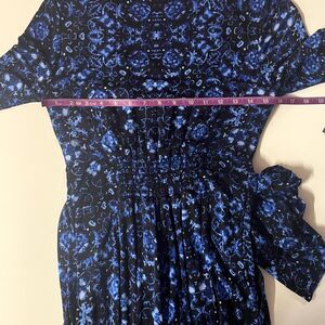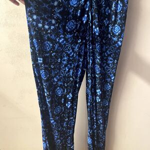 Beautiful black jumpsuit with a blue and white print all over! It has a v-neck and gold zipper down the neckline. In excellent condition! Throw on a pair of black or blue strappy heels and some gold accessories and a clutch or small shoulder bag, and you're good to go! Approximate measurements shown in photos! Feel free to ask questions or make an offer!