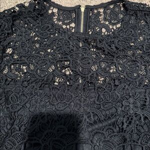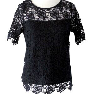 Chic black lace blouse with floral pattern. Short sleeves and elegant design. Perfect for stylish outings. Gold back zip up closure. Excellent new condition.