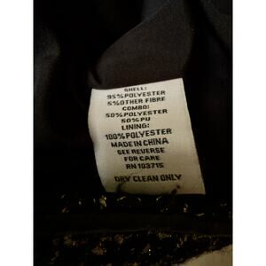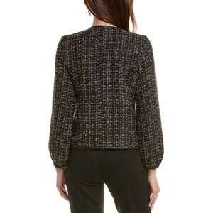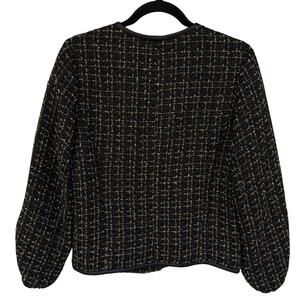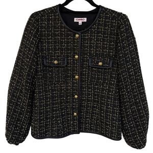 Elevate your wardrobe with this stunning Nanette Lepore Size 8 black and gold tweed lady jacket, designed with a luxe look. Crafted in a textured bouclé tweed, this jacket features faux-leather piping, gold crest buttons, and front flap pocket accents for a polished, sophisticated finish. The rounded neckline, structured silhouette, and slightly voluminous sleeves create a timeless, feminine shape that pairs beautifully with denim, trousers, or skirts.
