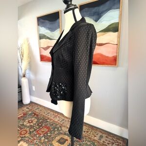 Keywords: Nanette Lepore jacket, vintage designer jacket, black polka dot blazer, sequin pocket jacket, tailored vintage jacket, size 4 Lepore, elegant evening jacket, collectible Nanette Lepore, retro chic blazer, black statement jacket, cocktail jacket, vintage Nanette Lepore fashion.