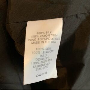100% Silk with 100% Rayon Trim and 100% Polyester lining.