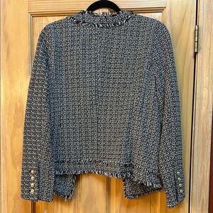 This blazer showcases a sophisticated black and white tweed design, perfect for adding a touch of elegance to any ensemble. The cropped, boxy silhouette and textured bouclé fabric offer a timeless appeal, while the fringed edges provide a modern twist. Ideal for both formal and casual occasions, this blazer embodies the essence of luxury fashion.