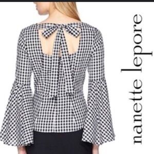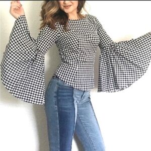 Nanette Lepore Black/White Checker Oversize Bell Sleeve Cotton Peasant Top (M)