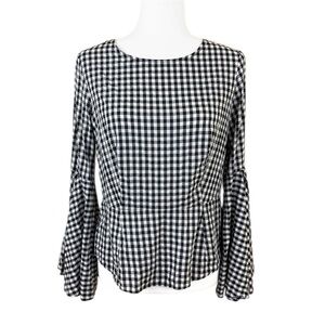This elegant blouse by Nanette Lepore features a sophisticated black and white checkered color scheme with beautiful oversized, ruffled bell, sleeves and a fitted silhouette. The long sleeves and 100% Cotton fabric make it perfect for both casual and business casual settings, offering a timeless and versatile style.
