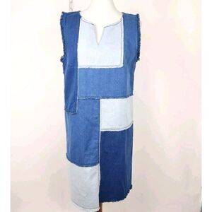 Nanette Lepore Blue Denim Patchwork V Neck Shift Dress Sleeveless Raw Edge sz M