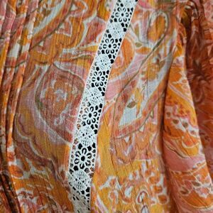 This is a short-sleeved boho-style blouse by Nanette Lepore. It is orange with abstract paisley print and white crochet lace detailing. This blouse has pleating on the chest and flutter sleeves. On the back is a keyhole opening which is closed with a small button.