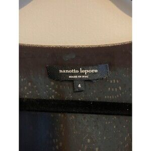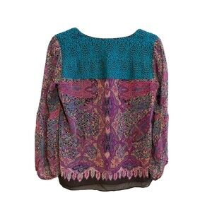 The Nanette Lepore Teal Purple Silk Crochet Back Detail Lined Top is a stylish and versatile piece perfect for various occasions. This floral and paisley patterned blouse features a scoop neck, long sleeves, and a pullover closure. Made from luxurious silk chiffon, it offers a regular fit and comes in a USA size 4. The intricate crochet accents add a touch of bohemian flair, making it a standout piece for those who appreciate unique and colorful designs. Ideal for parties or casual wear, this top embodies a blend of retro and hippie styles with a hint of rainbow-inspired themes.