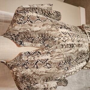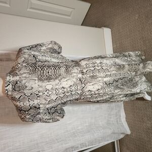 This elegant midi dress by Nanette Lepore features a sophisticated black and white design with a mandarin collar and flutter sleeves. The buttoned front and relaxed silhouette make it perfect for both casual and work settings. Crafted from a lightweight fabric, it offers a comfortable and stylish fit for any occasion.