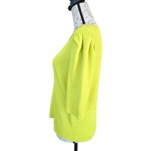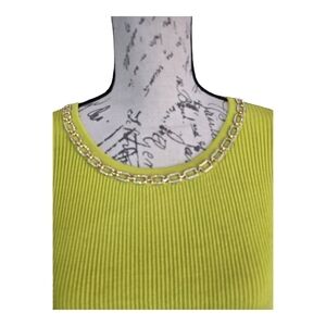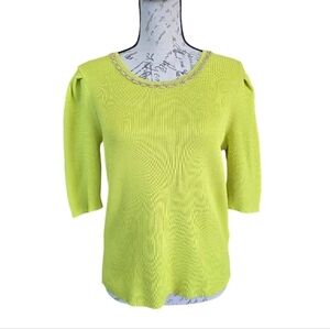 New with tags Nanette Lepore citrine green ribbed short sleeve crew neck sweater. Goldtone link with clear rhinestones accent neckline. Ruching on shoulders. Brand new, excellent condition.