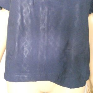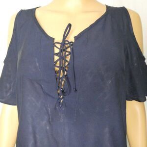 Lovely dark blue cold shoulder blouse. Features a subtle diamond pattern and lace up detail on the front. Small flaw at the bottom on the back, otherwise in excellent condition.