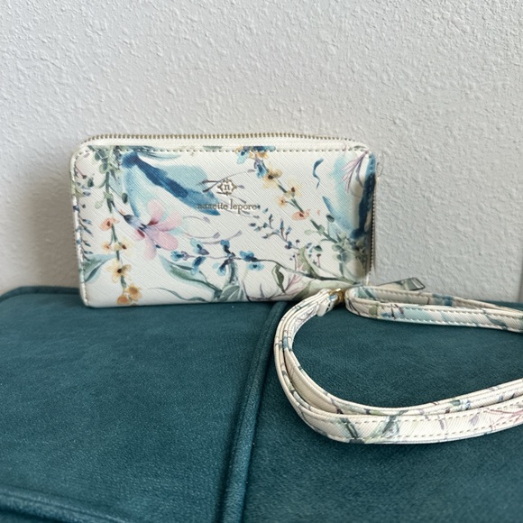 Chic cream wallet with floral design. Features blue and pink accents. Stylish and elegant.