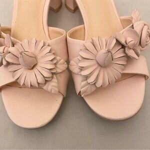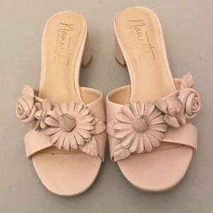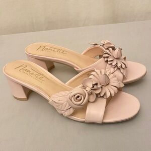 Nanette Nanette Lepore Dainty Floral Pink Shoes, Sandals, Block Heels, Rosettes, Size 7. Preowned. Some gentle wear. The factory glue is a tiny bit visible on the right shoe and the bottoms have markings.