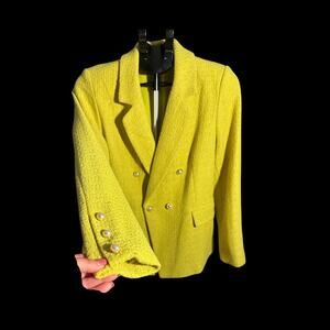 Nanette Lepore, blazer, double breasted, structured blazer, women's jacket, tailored, size 10, yellow blazer, citrine blazer, workwear, office jacket, spring blazer, statement blazer, career wear, NWT, designer blazer, boucle blazer, textured tweed