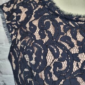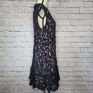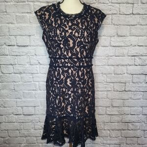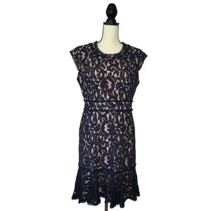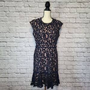 Nanette Lepore Dress Blue Lace Nude Lining Cap Sleeve Flouce Hem Size 12