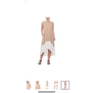 This Nanette Lepore dress in size 14 is a sleeveless sheath style with a cream and white color block design. Made of a blend of Ramie, Linen, and Lyocell, it features a frayed hem and falls to a midi length. Suitable for various occasions such as travel, parties, or casual outings, this dress embodies a mix of hipster, beach, hippie, bohemian, coastal, and classic themes, perfect for the summer, fall, and spring seasons.