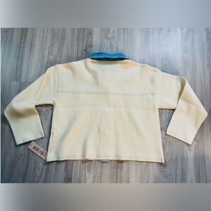 A chic statement piece from Nanette Lepore, this cropped jacket combines cozy ecru fabric with stylish denim contrast. Featuring oversized front flap pockets, raw edge denim detailing, and a modern boxy cut, it’s the perfect blend of casual and polished.
